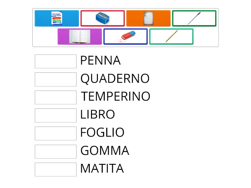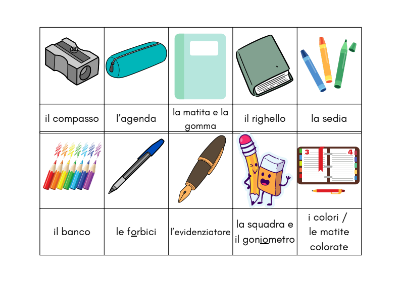 Lessico I colori La famiglia Gli oggetti della scuola Le materie scolastiche Il cibo La casa I numeri da 1 a 20 I numeri da 20 a 50 Che ore sono? Che giorno è oggi? Giorni e mesi L'aula Le parti della faccia